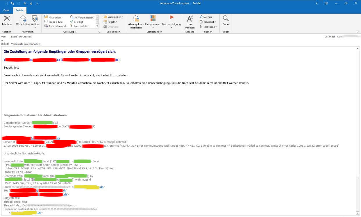 Meldung: Die Zustellung an folgende Empfänger oder Gruppen verzögert sich  [GELÖST]